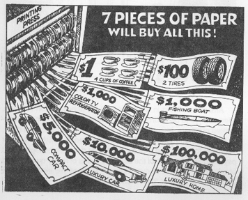 something out of nothing. A piece of paper of little value is printed so that it is worth a piece of lumber. With different figures it can buy the automobile or even the house. Its value has been created
